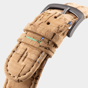 - Vegan paper leather strap, made from cellulose, latex and cork are comfortable, durable, and can be swapped quickly thanks to the quick-release mechanism.